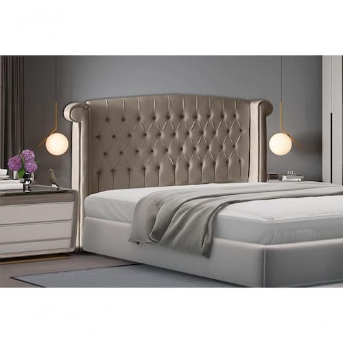 Essa cabeceira casal estofada é um Luxo só, isso porque o seu design curvo somado aos botões revestidos cria um ambiente clássico e charmoso.