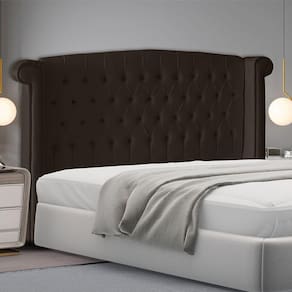 Essa cabeceira casal estofada é um Luxo só, isso porque o seu design curvo somado aos botões revestidos cria um ambiente clássico e charmoso.