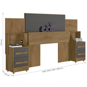 Cabeceira De Casal Extensível Síria Cinamomo Com Grafite - Rv Móveis A Cabeceira de Casal Síria - RV Móveis é o produto mais indicado para quem deseja beleza e conforto enquanto aproveita seu momento de descanso. Possui dois criados com gavetas com corrediças telescópicas e puxadores em MDF, além de tomadas embutidas. Conta também com design moderno, sem deixar de lado requinte e sofisticação.Dimensões do Produto Montado:Altura: 137,5 cmLargura: 227/247/267 cmProfundidade: 37 cmObservações:- Adaptável para box de 1,40, 1,60, 1,90 e 2m;- Painéis em MDF;- Criados com Corrediças telescópicas;- Puxadores em MDF;- 2 Tomadas inclusas;- Pintura Ultravioleta com acabamento fosco na cor grafite;- Pintura Ultravioleta com acabamento amadeirado na cor cinamomo.