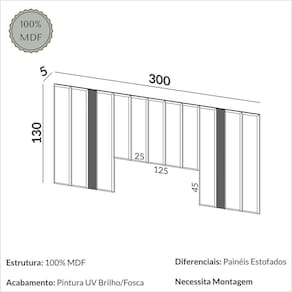 cabeceira para cama de casal estofada de 300cm de largura, na cor freijó madeirado fosco com tecido na cor verde, acompanha acessórios de montagem e fixação na parede, utilizada em quartos , design moderno. Produto Montado: Sim Ambiente Principal: Quarto Cabeceira Estofada: Sim codigo_ean: 7900288225368 Complexidade da Montagem: Média: pode ser montado por mais de uma pessoa e/ou necessite de maior conhecimento para montagem Cor: Freijó/Verde Cor do Produto: Freijó/Verde Densidade da Espuma: D-20 Escala de Brilho: Fosco Extensível: Não Fixação Box: Não Fixação na Parede: Sim Itens Inclusos: 1 Cabeceira, Kit Ferragens e Manual de Montagem Largura do Colchão Indicado: 138cm/158cm Linha ou Coleção: Marrom Manual de Montagem e Instalação: https://product-hub-prd.madeiramadeira.com.br/140714349/documents/ce1be07d-3390-4150-a8ed-21dc71de44a0ce103d9e8959320tw194195196.pdf Marca: Dalla Costa Material Principal: MDF Necessita Montagem: Sim Origem do Produto: Nacional Peso: 42,5 kg Possui Baú: Não Possui Espelho: Não Possui Mesa de Cabeceira: Não Possui Pés: Não Possui Vidro: Não Recomendações de Uso, Manutenção e Limpeza: Pano seco Sistema de Montagem: Parafusos Tipo de Colchão: Casal