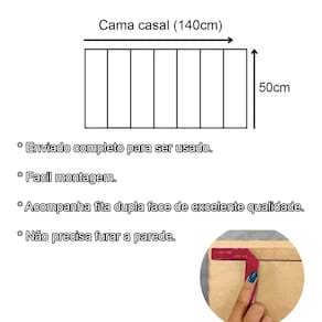Transforme seu quarto com a Cabeceira Modulada Casal 140cm, a escolha perfeita para quem busca um toque de modernidade, conforto e praticidade. Com instalação fácil e sem necessidade de furar a parede, ela é ideal para camas box de casal, proporcionando proteção à parede e valorizando a decoração do ambiente.Diferenciais do Produto:Instalação sem furos: fixação com fita adesiva de alta resistência – rápida, limpa e segura.Altura ajustável: compatível com diversos modelos de cama box casal.Espuma macia e confortável: ideal para leitura, uso do celular ou momentos de relaxamento.Design moderno e versátil: adiciona elegância e personalidade ao quarto.Proteção para a parede: evita manchas e desgaste causados pelo contato direto com a cama.Benefícios:Fácil instalação e remoçãoToque suave e aconcheganteVisual elegante, funcional e atualDimensões Aproximadas:Largura: 140 cmAltura: 50 cmInformações Adicionais:Limpeza: pano úmido com detergente neutro ou aspirador de póCores podem variar de acordo com iluminação ou tela do dispositivoProduto enviado pronto para instalaçãoMontagem: não realizamos montagem; caso necessário, o serviço deve ser contratado pelo clienteCabeceira Modulada Casal 140cm: conforto, proteção e beleza em um único produto – ideal para quem valoriza praticidade sem abrir mão do estilo.