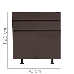 - Largura: 90 cm; - Altura: 126 cm; - Profundidade: 11 cm; - Produto estofado; - Produzido em Madeira de Pinus e Eucalipto; - Pés em pvc;