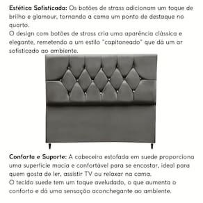 Fabricada com materiais de alta qualidade, como madeira eucalipto e revestimento em suede, esta cabeceira é durável e resistente, além disso os detalhes de costura com strass conferem um toque de sofisticação e elegância ao seu espaço.