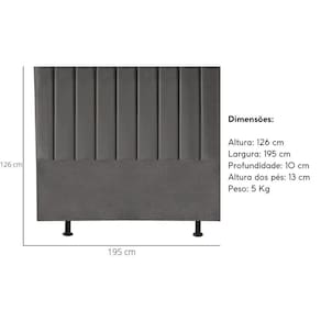 Transforme sua decoração com a elegância da Cabeceira Estofada King Size Alice Carla!   Ideal para quem busca estilo e conforto, a Cabeceira Cama King Alice Carla é o toque perfeito para o seu quarto.   Com um design único e detalhes que encantam, a Cabeceira Alta Alice Carla é a escolha certa para acompanhar sua cama e garantir momentos de relaxamento ainda mais aconchegantes. Seja para apoiar as costas enquanto lê um livro ou assistir TV, ela proporciona conforto incomparável. Fabricada com materiais de alta qualidade, como madeira eucalipto e revestimento em suede, esta cabeceira é durável e resistente, garantindo não apenas estilo, mas também funcionalidade para o seu ambiente.   Não perca tempo! Adquira já a sua Cabeceira Moderna Alice Carla e transforme seu quarto em um espaço ainda mais acolhedor. Aproveite agora mesmo!   Dimensões:   Altura: 126 cm Largura: 195 cm Profundidade: 10 cm Altura dos pés: 13 cm Peso: 13 Kg   Especificações do Produto:   Estrutura: Madeira Eucalipto de alta qualidade Tecido: Suede Espuma: D-20 Material dos pés: Plástico Não acompanha o kit frame Os parafusos para fixação do frame e os pés serão enviados dentro do forro, na parte de trás da cabeceira Montagem: O produto vai montado, necessitando apenas rosquear os pés (2) Instruções de Limpeza: Utilizar um pano limpo e levemente úmido Você irá receber: 01 volume     Observações Relevantes:   Produto para uso residencial em ambiente interno, não devendo ficar exposto diretamente ao sol, calor e umidades excessivas; As imagens são meramente ilustrativas, não acompanham objetos de decoração e eletros;   Cabeceira Casal Cabeceira Queen Cabeceira de cama Cabeceira capitonê Cabeceira king de madeira Cabeceira rústica king Cabeceira retrô king Cabeceira sob medida king Cabeceira king MDF