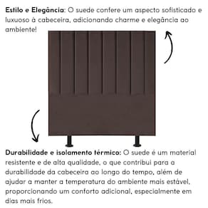 Fabricada com materiais de alta qualidade, como madeira eucalipto e revestimento em suede, esta cabeceira é durável e resistente, garantindo não apenas estilo, mas também funcionalidade para o seu ambiente.