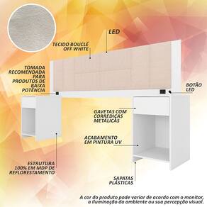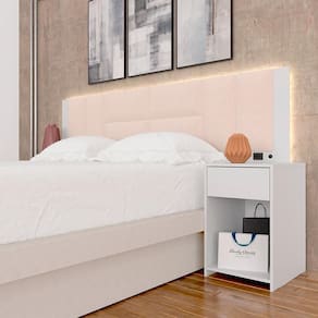 A Cabeceira Estofada Mumbai com design elegante, ela conta com iluminação em LED, criando uma atmosfera acolhedora. As mesas de cabeceira com gaveta oferecem praticidade e organização.