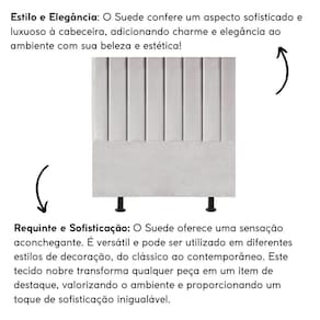 Fabricada com materiais de alta qualidade, como madeira eucalipto e revestimento em suede, esta cabeceira é durável e resistente, garantindo não apenas estilo, mas também funcionalidade para o seu ambiente.