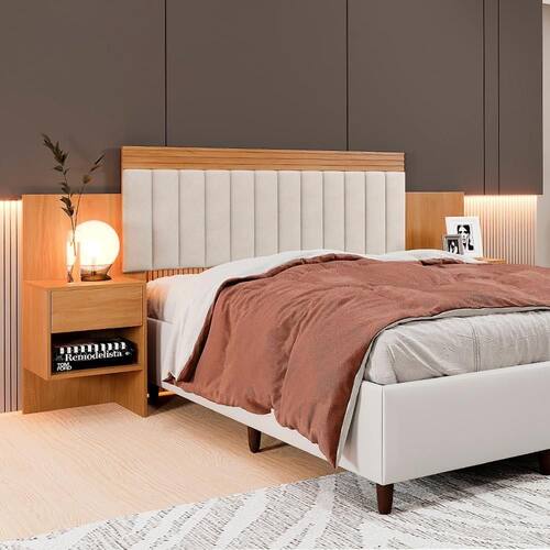 O design completo inclui duas mesas de cabeceira acopladas, cada uma com 2 gavetas espaçosas e corrediças telescópicas, proporcionando ótimo aproveitamento de espaço para organizar objetos pessoais com praticidade.