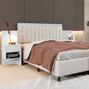Características: Estrutura em MDP/MDF 2 Mesas de cabeceira 2 Gavetas Nicho Corrediças telescópicas Indicado para colchões de 140 cm -casal- e 160 cm -queen- Detalhes estofados em linho Obs.: Não acompanha cama nem colchão