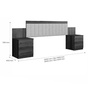 Materiais e Estrutura: Produzido em chapa de 15 mm 2 mesas de cabeceira 6 gavetas com corredicas telescopicas Montagem dupla para colchoes de 140 cm e 160 cm Acabamento em tecido linho