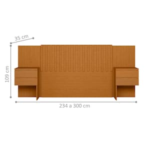 Feito em MDP. É extensiva com abertura p colchões de casal, box comuns, queen size e king size, até 210 cm e acompanha 2 mesas de cabeceira.