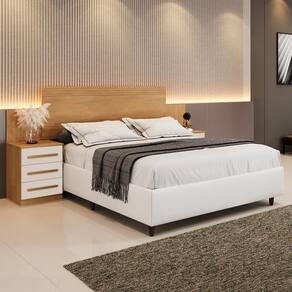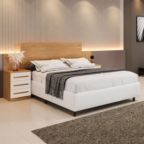 Características: Estrutura em MDP 2 Mesas de cabeceira 6 Gavetas Indicada para colchão: de 140 cm -casal padrão- e 160 cm -queen size-, Corrediças telescópicas Detalhes frisados Puxadores em madeira na mesma tonalidade do produto Obs.: Não acompanha cma nem colchão.