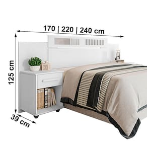 CARACTERISTICAS Altura: 125 cm Largura: Solteiro – 170 cm | Casal – 220 cm | Queen – 240 cm Gavetas: 01 por Mesa de Cabeceira Puxador: Externo Pés: Sim Material: Misto (MDP/MDF) Acabamento: Pintura Necessita Montagem: Sim Ambiente: Quarto Itens Inclusos: 1 Cabeceira e 1 Manual de Instalação Recomendações de Uso, Manutenção e Limpeza: Limpeza deve ser feita com pano seco.
