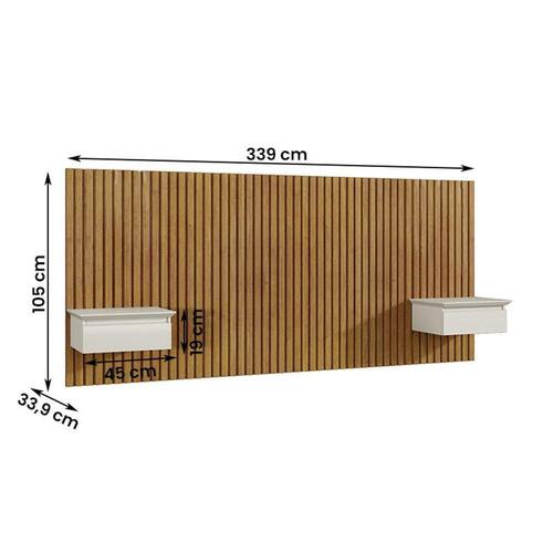 Modelo: Paris;Altura: 105 cm;Largura: 339 cm;Profundidade: 33,9 cm;Tamanhos de cama: King;Material da cabeceira: Placas de MDP e gaveta MDF/MDP;Material do estofado: Não se aplica;Revestimento: Não se aplica;Tipo de montagem: Suspenso;É adequado para cama box: Sim;Com altura ajustável: Não se aplica;Com mesa de cabeceira: Sim, 2 mesas de cabeceira;Possui gavetas: Sim, 2 com corrediças telescópicas;Possui nichos: Não se aplica;Peso Suportado: até 10 kg distribuídos; Requer montagem: Sim (kit montagem incluso);Embalagem do envio: Papelão e plástico.Informações adicionais:- Os objetos que ambientam as fotos não acompanham o produto;- O produto será entregue desmontado;- É de inteira responsabilidade do cliente a montagem do produto e/ou instalação, custos de transporte por escadas e/ou elevadores, guincho ou içamento, assim como possíveis irregularidades provenientes de manuseio inadequado;- Embora o produto acompanhe o manual de montagem, verifique a complexidade antes de decidir montá-lo sozinho, recomendamos que contrate um profissional de sua confiança;- Fique atento, nossas cores podem sofrer alterações dependendo do seu monitor;- ANTES DE MONTAR O SEU PRODUTO, certifique-se que todas as instruções dispostas no manual, bem como todas as ferragens descritas, estejam presentes dentro da embalagem. Verifique se há alguma peça danificada, caso esteja, prestaremos a devida assistência dentro do prazo da garantia.