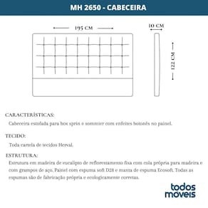 A cabeceira MH-2650 é ideal para trazer mais sofisticação para o quarto, tem design moderno e um acabamento detalhado, produto de grande qualidade que contribui e valoriza ainda mais o ambiente. Com sua estrutura em madeira de reflorestamento e estofada com espuma ecológicas proporcionando estabilidade e segurança. Suas medidas são 122 cm de altura, 195 cm de largura e 3 cm de profundidade, ideal para cama king. Há outras possibilidades de acabamento para o revestimento.