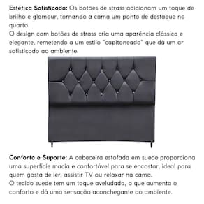 Fabricada com materiais de alta qualidade, como madeira eucalipto e revestimento em suede, esta cabeceira é durável e resistente, além disso os detalhes de costura com strass conferem um toque de sofisticação e elegância ao seu espaço.