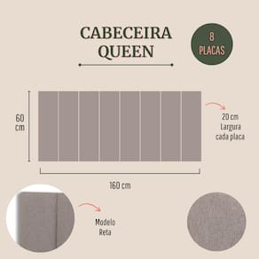 CONFIRA ABAIXO MAIS DETALHES SOBRE O PRODUTO: Tamanho Queen (8 placas): 160cm (comprimento total) x 60cm (altura) x 3 cm (profundidade). Altura de cada placa: 60 cm Largura de cada placa: 20cm Materiais: 100% MDF; Espuma; Fita 3M; Cores e Tecidos: temos 25 variações de cores e tecidos. Escolha a que você mais gosta.