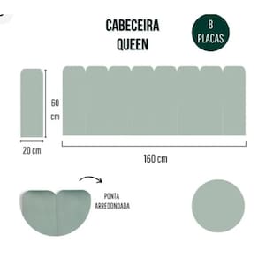 Descrição técnica Atura: 60 cm Profundidade: 3 cm Comprimento: 160 cm 20 cm por módulo; a cama queen leva 08 módulos Materiais: - madeira mdf de reflorestamento; - espuma d28, antialérgica; - veludo verde claro.