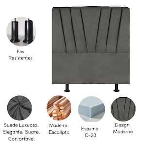 Fabricada com materiais de alta qualidade, como madeira eucalipto e revestimento em suede, esta cabeceira é durável e resistente, garantindo não apenas estilo, mas também funcionalidade para o seu ambiente.
