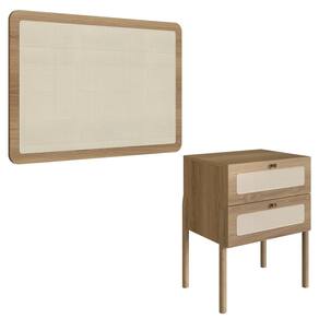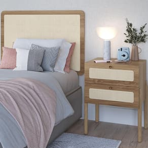 Cabeceira e Mesa de Cabeceira 27976, o conjunto ideal para deixar seu quarto mais elegante. Produzido em madeira maciça Eucalipto e MDP 15 mm com acabamento BP. A mesa de cabeceira conta com 2 gavetas com corrediças metálicas, puxadores em poliestireno dourado e detalhes em tela sintética (PVC) que imita palhinha. Possui ainda sapatas emborrachadas para proteger o piso contra atritos. Produto entregue em 3 volumes.