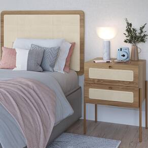 Cabeceira e Mesa de Cabeceira 28976, o conjunto ideal para deixar seu quarto mais elegante. Produzido em tubo metálico em aço com pintura epóxi dourada e MDP 15 mm com acabamento BP. A mesa de cabeceira conta com 2 gavetas com corrediças metálicas, puxadores em poliestireno dourado e detalhes em tela sintética (PVC) que imita palhinha. Possui ainda sapatas emborrachadas para proteger o piso contra atritos. Produto entregue em 3 volumes.
