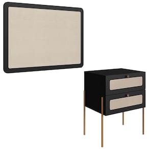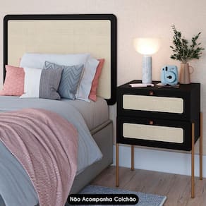 Fabricada em MDP com acabamento BP e detalhes em tela sintética, a Cabeceira Solteiro oferece durabilidade e um toque acolhedor ao quarto. O design retrô sofisticado harmoniza perfeitamente com diversos estilos, enquanto os suportes metálicos garantem uma instalação firme e discreta. Já a Mesa de Cabeceira é ideal para manter o quarto organizado. Com 2 gavetas espaçosa equipada com corrediças metálicas e puxador de poliestireno, oferece espaço extra para itens pessoais. Feita em MDP 15 mm e pés metálicos com acabamento epóxi, a mesa combina resistência e sofisticação no Quarto de Solteiro.