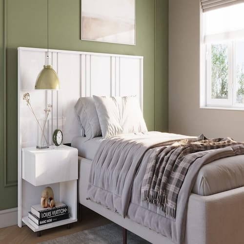 MDP | MDFEssa Cabeceira Solteiro possui design inovador e sofisticado. Acompanha rack lateral que é ideal para organizar seus objetos pessoais.