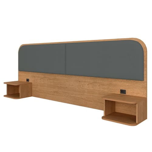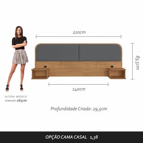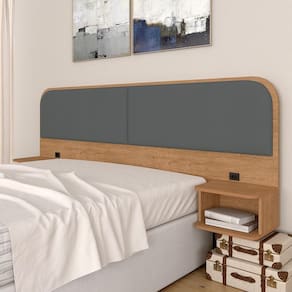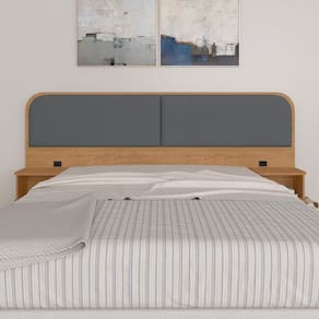 Materiais de Fabricação - Estrutura: MDP de 12mm, 15mm e 25mm, e MDF de 15mm - Tecido: Suede - Tonalidade: Carvalho Americano/Suede Cinza - Medida para Cama: 138cm - Mesinha de cabeceira com 1 nicho cada - Tomadas de energia recomendadas para uso de produtos de baixa potência