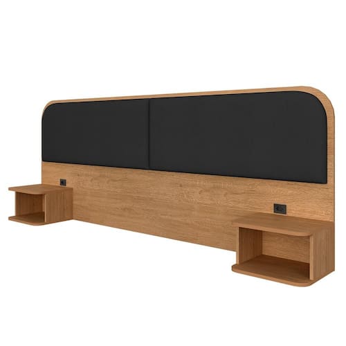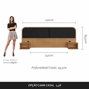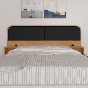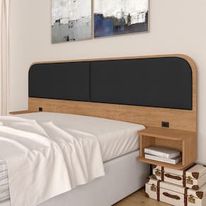 Materiais de Fabricação - Estrutura: MDP de 12mm, 15mm e 25mm, e MDF de 15mm - Tecido: Suede - Tonalidade: Carvalho Americano/Suede Preto - Medida para Cama: 138cm - Mesinha de cabeceira com 1 nicho cada - Tomadas de energia recomendadas para uso de produtos de baixa potência