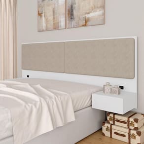 Materiais de Fabricação - Estrutura: MDP de 12mm, 15mm e 25mm - Tecido: Suede - Tonalidade: Branco/Suede Bege - Medida para Cama: 138cm - Mesinha de cabeceira com 1 gaveta cada - Corrediças Metálicas - Cada gaveta suporta até 5kg distribuídos - Tomadas de energia recomendadas para uso de produtos de baixa potência