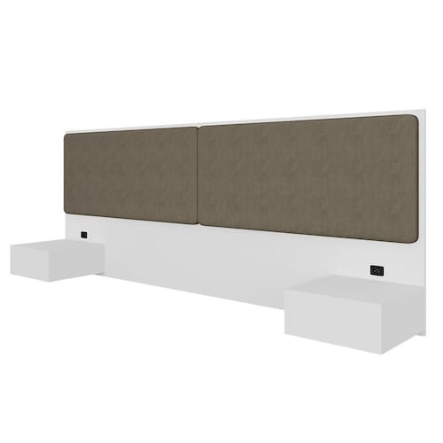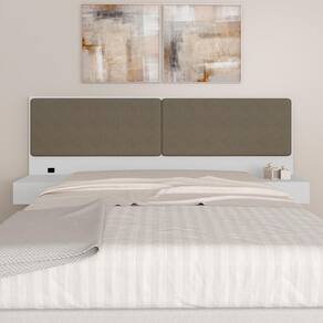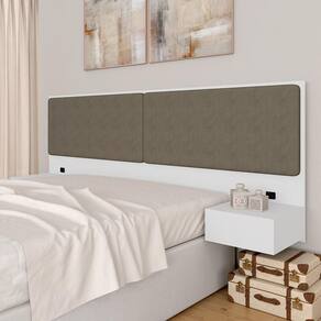 Materiais de Fabricação - Estrutura: MDP de 12mm, 15mm e 25mm - Tecido: Suede - Tonalidade: Branco/Suede Capuccino - Medida para Cama: 138cm - Mesinha de cabeceira com 1 gaveta cada - Corrediças Metálicas - Cada gaveta suporta até 5kg distribuídos - Tomadas de energia recomendadas para uso de produtos de baixa potência