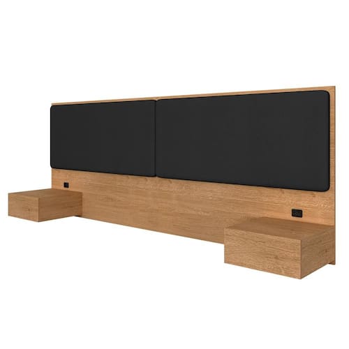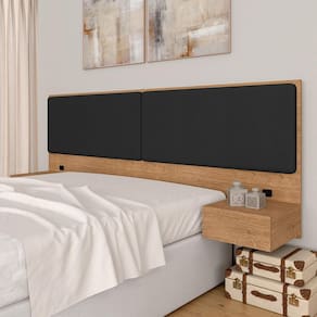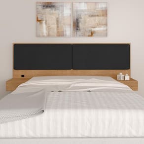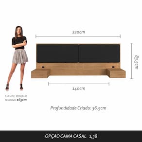 Materiais de Fabricação - Estrutura: MDP de 12mm, 15mm e 25mm - Tecido: Suede - Tonalidade: Carvalho Americano/Suede Preto - Medida para Cama: 138cm - Mesinha de cabeceira com 1 gaveta cada - Corrediças Metálicas - Cada gaveta suporta até 5kg distribuídos - Tomadas de energia recomendadas para uso de produtos de baixa potência