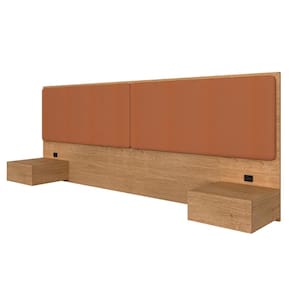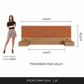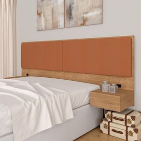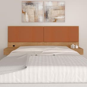 Materiais de Fabricação - Estrutura: MDP de 12mm, 15mm e 25mm - Tecido: Suede - Tonalidade: Carvalho Americano/Suede Terracota - Medida para Cama: 138cm - Mesinha de cabeceira com 1 gaveta cada - Corrediças Metálicas - Cada gaveta suporta até 5kg distribuídos - Tomadas de energia recomendadas para uso de produtos de baixa potência