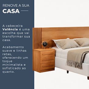 A Cabeceira Valência é ideal para deixar o seu quarto mais confortável e aconchegante. Ela conta ainda com duas mesas de cabeceira que deixará tudo mais organizado. Nelas, tem gavetas em corrediças telescópicas proporcionando maior abertura e melhor aproveitamento do espaço. É produzida em chapa de 15mm. Pode ser utilizada para colchões de 140 ou 160cm. Além disso, não necessita parafusar na parede, dando mais flexibilidade no seu ambiente.