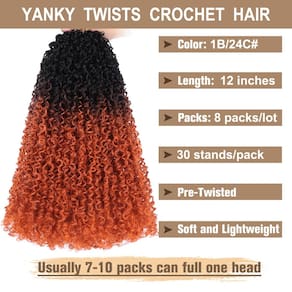 Nome do produto: Cabelo de crochê sintético Yanky Twists pré-penteado COOKOO 30,5 cm Material do cabelo: Crochet yanky twists Hair for Women are made of high temperature synthetic fiberhair. Comprimento do cabelo: tranças de crochê torcidas torcidas de 30 cm Cor do cabelo: 9 cores estão disponíveis, (1B#, 350#, 1B/27#, 1B/30#, 1B/Bug#, 4/27#, 1B/30/27#, 1B/27/613#, preto/roxo/azul escuro). Mais cores e centímetros serão adicionados. Pacote de cabelo: 8 pacotes/lote, 30 fios/pacote, você pode comprá-lo junto com outras cores para fazer você mesmo suas próprias torções exclusivas. Por que nos escolher? 1. Nosso cabelo de crochê Bohemian Passion Twists é feito de fibra sintética, feito à mão, é macio, sem emaranhamento, sem queda, extremamente leve, inodoro, adequado à água, despreocupado, pronto para nós e reutilizável. Instalação rápida e fácil, economia de tempo, ampla variedade de usos. 2. O cabelo trançado torcido pré-torcido tem cachos muito naturais nas pontas, fica lindo quando você usá-lo, você pode usá-lo em festas e no uso diário, você receberá muitos elogios. 3. Esta extensão de cabelo sintético Goddess Passion Twist é mais fofa do que o cabelo de paixão atualmente no mercado, mas também mais leve para que você não sinta nenhum peso ao usá-lo. É adequado para nadar e tomar banho, e cada trança tem um efeito único de ondulação e ondulação para um visual muito natural. Uma agulha de crochê está incluída no pacote. - ?Cabelo de crochê torcido Yanky torcido de 30,5 cm? Prepare-se para mostrar seu charme com nossas lindas pontas cacheadas trançadas Yanky Twists! Nosso novo estilo de tranças de crochê Bohemian Yanky Twists é pré-torcido, com pequenos cachos muito naturais nas pontas, muito fofos. 8 pacotes/lote, 30 fios/pacote, total de 240 fios, geralmente 7-10 pacotes podem encher uma cabeça. Há muitas cores para escolher para combinar com o seu estilo! - ?Feito de material de alta qualidade, sem queda]?Nosso pequeno cabelo de crochê Passion Twist é feito de fibra sintética de alta qualidade, 100% feito à mão, é macio, sem emaranhamento, sem queda, extremamente leve, inodoro, adequado à água, despreocupado, pronto para nós e reutilizável. Parece muito natural e tem a aparência geral do cabelo humano. Além disso, já que foi pré-torcido, não embaraça, então se você estiver mais preocupado com isso, fique tranquilo. - ?Instalação rápida e fácil?O cabelo trançado sintético Yanky Twist tem um design pré-laço separado, por isso é muito fácil de usar e economizará tempo e dinheiro, permitindo que você obtenha um visual profissional sem esforço em um curto espaço de tempo! - ?Leve e duradouro?O cabelo curto Yanky Passion Twists é muito leve e brilhante, e será muito relaxante de usar sem qualquer peso no seu cabelo, garantindo plenitude. Este estilo não só fica ótimo, mas também oferece proteção para o seu cabelo natural. Com cuidado simples, este cabelo pode durar até 12 semanas ou até mais, tornando seu cabelo mais saudável e melhor. - ?Penteado variável? Este cabelo trançado de crochê pré-torcido Majesty é versátil, além de ser utilizado diretamente, você pode usar sua própria imaginação para fazer diferentes penteados novos com Yanky Twist, como cabelo de crochê Butterfly Locs, Locs envelhecido, falsos locs, tranças de paixão, cabelo torcido senegalês e assim por diante. Este cabelo é adequado para mulheres de todas as idades, uso diário e sempre que quiser mostrar seu charme.