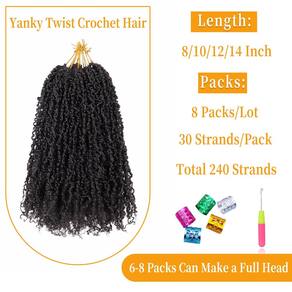 - Pacote: Cabelo de crochê torcido Yanky, com 8 pacotes/lote, 30 suportes/pacote, 240 fios no total + uma agulha de crochê. Geralmente 6-8 pacotes fazem um penteado completo. Você pode escolher entre uma ampla variedade de cores para combinar com seu estilo