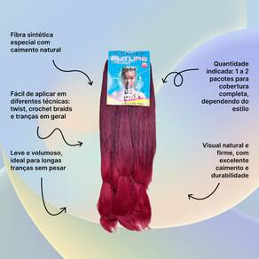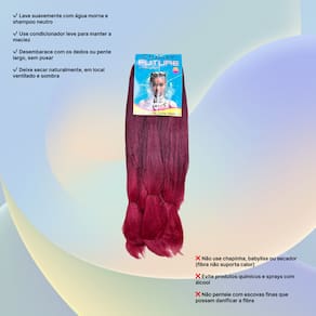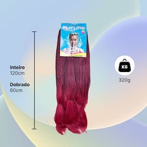Cabelos Future Jumbo 330g Fibra Sintética Para Tranças Box BraidsFibra sintética especial, o cabelo vai solto no estilo fio a fio pronto para ser aplicado e trançado,este modelo é ideal para tranças soltas, enraizadas, crochet braids, twist, box braids, alongamento entrelaçado e outros métodos de penteados.Especificações:Material: Fibra SintéticaMarca: ChereyPeso líquido: 330 gramasEstilo: Trança/Trançado/DreadTamanho: 60cmMétodo: Tranças enraizadas, crochet braids, twist, box braids, alongamento entrelaçadoNão aceita Quimica nem Temperatura por ser um cabelo sintético.Recomendações e Cuidados:* Lave e passe condicionador normalmente* Desembarace o cabelo com cuidado antes de lavar* Não esfregue ou torça o cabelo com força* Adicione shampoo suave a água morna e mexa o cabelo até limpar*Tire o excesso de água com uma toalha e deixe o cabelo secar naturalmente* Não escove os cabelos encaracolados* Penteie suavemente com os dedos
