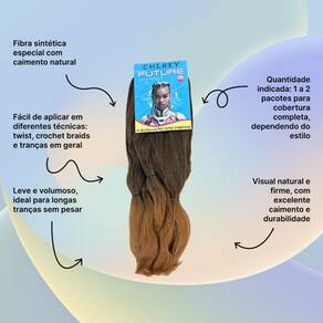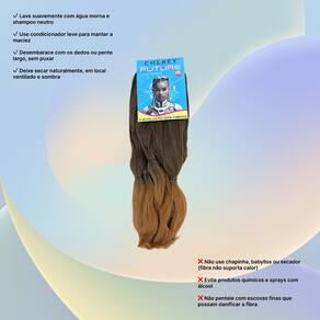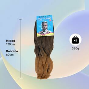 Cabelos Future Jumbo 330g Fibra Sintética Para Tranças Box BraidsFibra sintética especial, o cabelo vai solto no estilo fio a fio pronto para ser aplicado e trançado,este modelo é ideal para tranças soltas, enraizadas, crochet braids, twist, box braids, alongamento entrelaçado e outros métodos de penteados.Especificações:Material: Fibra SintéticaMarca: ChereyPeso líquido: 330 gramasEstilo: Trança/Trançado/DreadTamanho: 60cmMétodo: Tranças enraizadas, crochet braids, twist, box braids, alongamento entrelaçadoNão aceita Quimica nem Temperatura por ser um cabelo sintético.Recomendações e Cuidados:* Lave e passe condicionador normalmente* Desembarace o cabelo com cuidado antes de lavar* Não esfregue ou torça o cabelo com força* Adicione shampoo suave a água morna e mexa o cabelo até limpar*Tire o excesso de água com uma toalha e deixe o cabelo secar naturalmente* Não escove os cabelos encaracolados* Penteie suavemente com os dedos