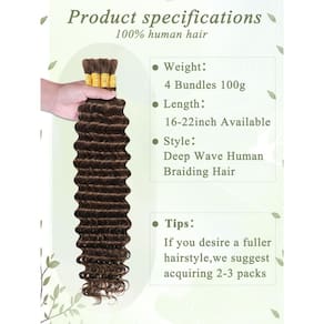- Comprimento e peso do cabelo trançado: o comprimento do cabelo trançado humano está disponível de 40 a 66 cm. O peso é de 100 gramas por pacote, um pacote tem 4 tranças de onda profunda. Recomendamos que você compre 2 ou 3 pacotes de cabelo humano a granel para trançar