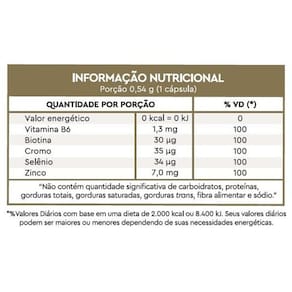 Ingredientes: Sulfato de zinco, Selenato de Sódio, Cloridrato de Piridoxina, Picolinato de Cromo, Biotina, Estabilizante Croscarmelose, Veículo Lactose e Antiumectante Dióxido de Silício.