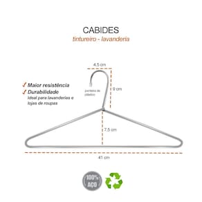 Cabides em aço cromado. Cabides de maior resistencia e durabilidade, produzido com aço reciclavel e cromeaçao com tratamento ecologico de efluentes. Os cabides sao perfeitos para lavanderias, tintureiros e lojas de roupas.