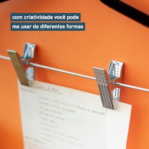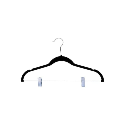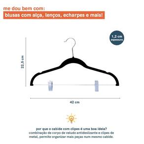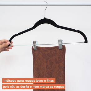 Esse é o cabide de veludo com clipes da OIKOS. Bacana para blusas com alça, lenços, echarpes e calças leves, seu revestimento de veludo deixa as roupas no lugar, sem escorregar. Os clipes ajustáveis na barra de metal se adaptam para peças de diversos tamanhos. De quebra, a combinação de corpo de veludo e clipes de metal, permite organizar mais peças num mesmo cabide.