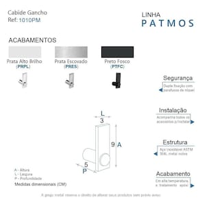 O cabide da linha Patmos possui um design atemporal e discreto, é uma peça de requinte que se destaca com glamour no seu banheiro. Além de decorar, organiza com funcionalidade o banheiro. Criado em aço inox com uma qualidade que abrange áreas litorâneas e possui a de um acabamento muito resistente. Agora é só você adquirir este lindo acessório e fazer o seu projeto se tornar realidade com um banheiro prático para toda a sua família. Características Fabricado em metal aço inox. Disponível no Prata Alto Brilho, Escovado e Preto Fosco. Pode ser instalado em parede, azulejo e porcelanato. Benefícios Fixação prática e segura com parafusos e buchas inclusos. O produto não possui nenhum detalhe em plástico ABS . Fácil higienização, ideal para locais que exigem limpeza constante. Aproveitamento inteligente do espaço, ideal para ambientes compactos. Resistente à corrosão e luz solar. Itens ENVIADOS: 1 cabide, kit de parafusos e manual instrução instalação. Instalação INTELIGENTE Ao 1º furo, use uma broca medida menor, após use a medida correta e finalize, vai ajudar na precisão da fixação da bucha principalmente em azulejos e porcelanato. Marca: Não Informado