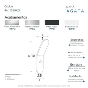 O cabide da linha Agata possui um design minimalista em linhas arredondadas, é uma peça de requinte que se destaca com luxo no seu banheiro. Além de decorar, organiza com funcionalidade o banheiro. Criado em metal nobre aço inox com uma qualidade que abrange áreas litorâneas e possui a de um acabamento muito resistente. Agora é só você adquirir este lindo acessório e fazer o seu projeto se tornar realidade com um banheiro prático para toda a sua família. Características Fabricado em metal aço inox. Disponível no Prata Alto Brilho, Escovado e Preto Fosco. Pode ser instalado em parede, azulejo e porcelanato. Benefícios Fixação prática e segura com parafusos e buchas inclusos. O produto não possui nenhum detalhe em plástico ABS . Fácil higienização, ideal para locais que exigem limpeza constante. Aproveitamento inteligente do espaço, ideal para ambientes compactos. Resistente à corrosão e luz solar. Itens ENVIADOS: 1 cabide, kit de parafusos e manual instrução instalação. Instalação INTELIGENTE Ao 1º furo, use uma broca medida menor, após use a medida correta e finalize, vai ajudar na precisão da fixação da bucha principalmente em azulejos e porcelanato. Marca: Não Informado Ean: 7908165324555