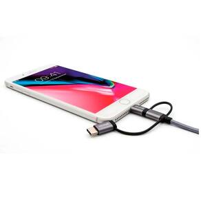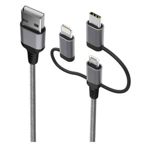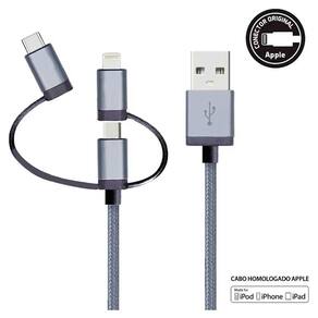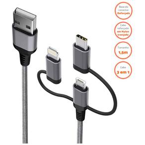 Com acabamento em nylon trançado e pontas metalizadas que o torna ainda mais resistente. Compatibilidade: Todos os aparelhos com entrada Micro USB e entrada USB-C e aparelhos com conector Lightning