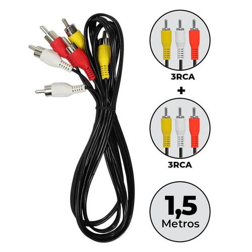 Especificações: - Conexão: Plugs RCA macho banhados - Cabo emborrachado de alta qualidade e resistente - Padrão de cores: segue todas as normas, sendo: Amarelo Imagem , vermelho e branco áudio estéreo - Comprimento: 1,5m - Cor: Preto