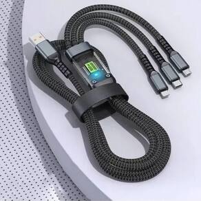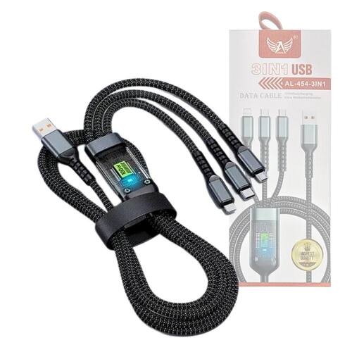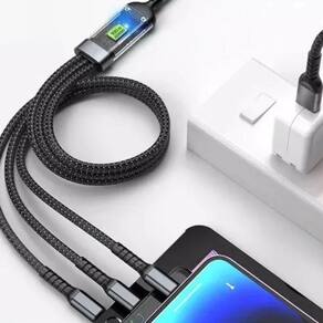 Código de barras: 7898824454313 Homologação Anatel: 109062214103 Cabo Carregador 3 in 1 conexão Tipo-C / V8 / Lightning de 1 metro 100W Marca: Altomex O Cabo Carregador 3 in 1 AL-454-3IN1 é um cabo de carregamento multifuncional projetado para carregar diversos tipos de dispositivos utilizando diferentes conectores, com a capacidade de suportar alta potência de carregamento. Características Principais: -Tipo: Cabo Carregador 3 em 1. Possui três tipos de conectores em uma única estrutura de cabo, oferecendo versatilidade para carregar diferentes dispositivos. Conexões: -Tipo-C: Um conector USB moderno e versátil, utilizado em muitos smartphones, tablets, laptops e outros dispositivos. -V8 (Micro USB): Um conector mais antigo, ainda presente em alguns smartphones Android, fones de ouvido, power banks e outros eletrônicos. -Lightning: O conector para aparelhos com porta de conexão Lightning. -Comprimento: 1 Metro. Um comprimento padrão que oferece praticidade para uso em diversas situações, sem ser excessivamente longo ou curto. -Potência: 100W. Indica a capacidade máxima de energia que o cabo pode suportar para carregamento. 100W é uma alta potência, capaz de carregar rapidamente smartphones, tablets e até mesmo laptops que suportam carregamento via USB-C Power Delivery (PD). A velocidade de carregamento para dispositivos V8 e Lightning dependerá das limitações desses padrões e dos adaptadores de energia utilizados. Funcionalidades: -Carregamento Multifuncional: Permite carregar dispositivos com portas USB Tipo-C, Micro USB (V8) e Lightning utilizando um único cabo, eliminando a necessidade de múltiplos cabos diferentes. -Carregamento de Alta Potência: A capacidade de suportar até 100W garante um carregamento rápido para dispositivos compatíveis com essa potência, especialmente aqueles que utilizam a porta Tipo-C com Power Delivery. -Organização: Reduz a bagunça de múltiplos cabos, oferecendo uma solução mais organizada para carregar seus dispositivos. -Portabilidade: Ideal para viagens, pois você precisa levar apenas um cabo para carregar diversos aparelhos. Disponível na cor: -Preto Medidas: L: 4,5 x C: 8,0 x A: 17,5cm Peso do Produto: 75g
