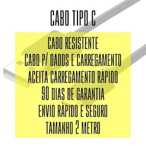 Cabo tipo c de 2 metrosCor enviada aleatoriamente branco ou pretoFique à vontade para tirar qualquer dúvida na aba de perguntas, estamos a disposição para atende-losModelo do cabo: tipo cTipo de cabo de dados: usbConector de saída: tipo cConector de entrada: usb tipo cVersão da porta usb: usb dataType-c: o conector type-c chegou há pouco tempo ao mundo, mas já está dominando e unificando o mercado, com a maioria dos novos dispositivos trazendo a entrada para este tipo de porta.São várias as vantagens do usb c ou type-c: resistência, velocidade na transmissão de dados e no carregamento.Desenvolvido com cabos trançados de cobre, o equipamento garante um carregamento extremamente rápido para seu aparelho. Por ser fabricado em borracha reforçada de alta resistência, o cabo da sumex tipo c 2.4a é um dos mais resistentes do mercado. Marca: Okane