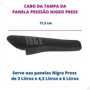 Nosso empenho é procurar o que há de mais atual e funcional no mundo culinário e para organização da sua casa, priorizando sempre a qualidade e a versatilidade dos produtos. Cabo da tampa panela nigro press 3 / 4,5 / 6 l Cabo superior da tampa da panela nigro press de 3 / 4,5 / 6 litros. O cabo é fabricado em baquelite antitérmico que garante ainda mais segurança durante o uso, pois reduzem a propagação do calor. Acompanha os dois parafusos para fixar na panela. Serve nos modelos: Nigro press de 3 litros; Nigro press de 4,5 litros; Nigro press de 6 litros. Atenção: não acompanha cabo inferior, alças, válvula de segurança e pino. Somente o cabo superior da tampa. Medidas: 17,5 cm x 4,5 cm Material: Baquelite e parafusos de alumínio Conteúdo da embalagem: 1 cabo superior panela nigro press Gostou Esse produto pode ser seu aguardamos sua compra Marca: Não Informado Ean: 7898749650227