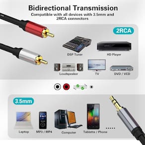 O cabo estéreo auxiliar 2RCA a 3,5 mm é amplamente compatível com todos os dispositivos de 3,5 mm, como iPad, smartphone, tablet, PC, laptops e dispositivos compatíveis com 2RCA, como amplificador Hi-Fi, AV, controlador de DJ, toca-discos, barra de som, alto-falante, sistema de home cinema, aparelho de som automotivo, DVD player, TV, caixa Sky HD, câmera de vídeo e assim por diante.